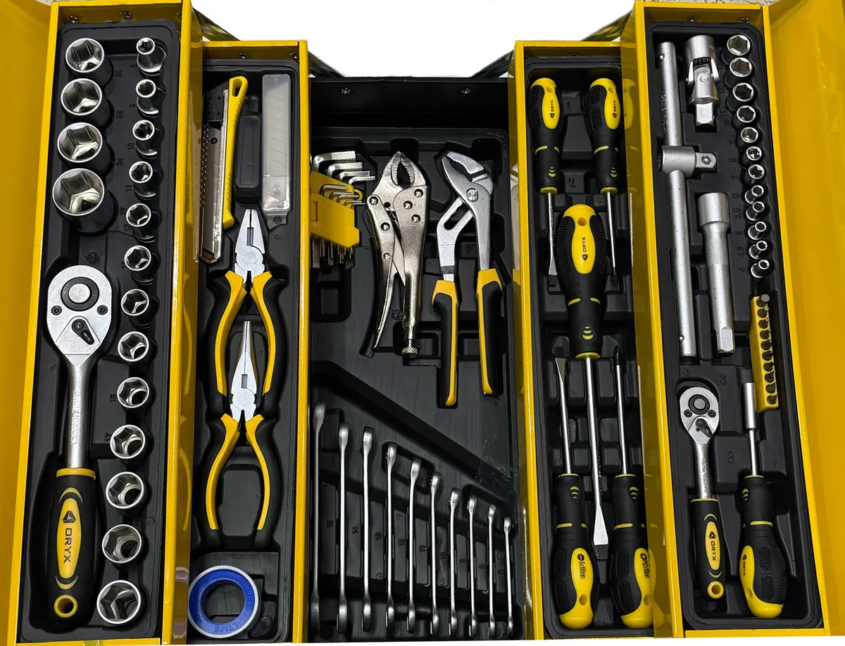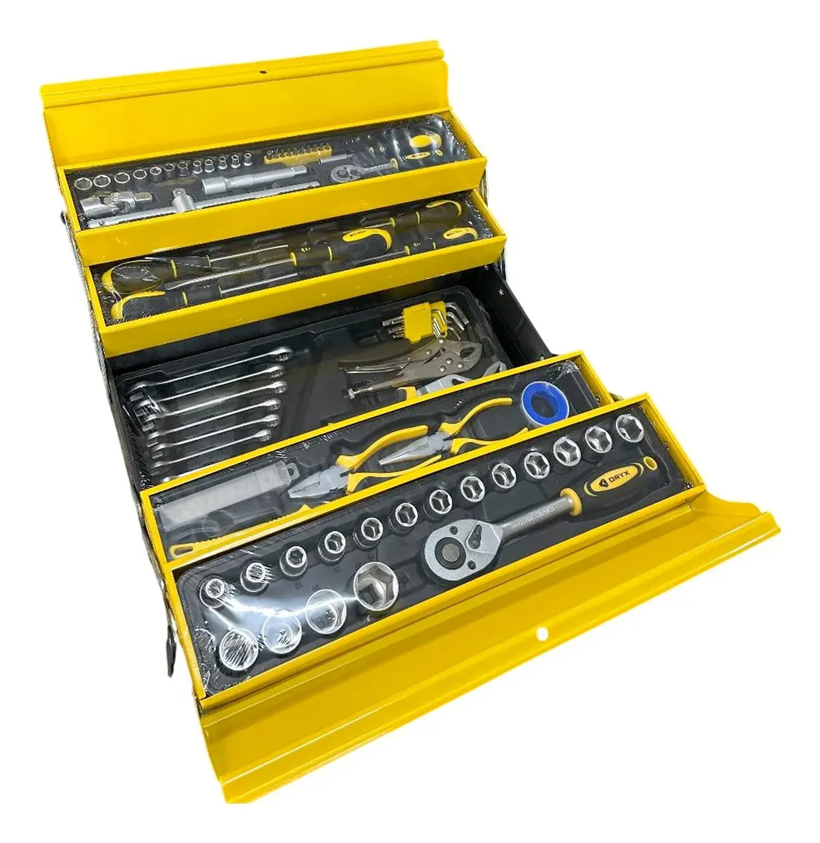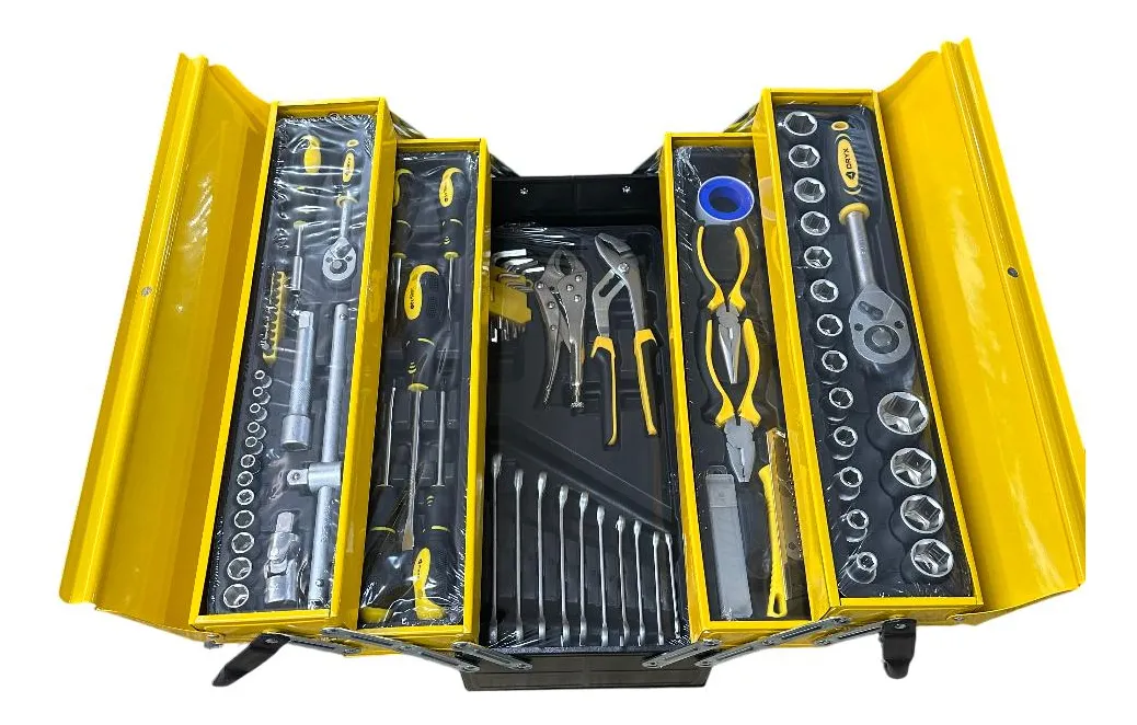 Pinzas y Cuchillo: 1 pinza de punta larga 6", 1 pinza combinada 6", 1 pinza pico de loro (tipo bomba de agua) 9", 1 pinza tipo grip (traba o bloqueo) 7", 1 cuchillo tipo cutter, 5 hojas de repuesto.
