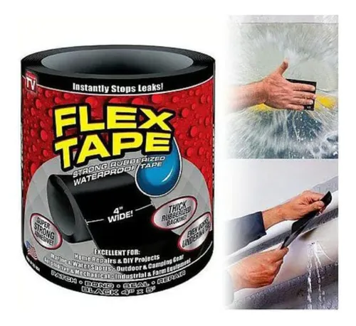 La cinta flex tape impermeable autofusión es ultraresistente y se adhiere a casi todas las superficies, ideal para reparar filtraciones de tanques de agua de plástico. Asegurarse que la superficie esté seca para una correcta aplicación