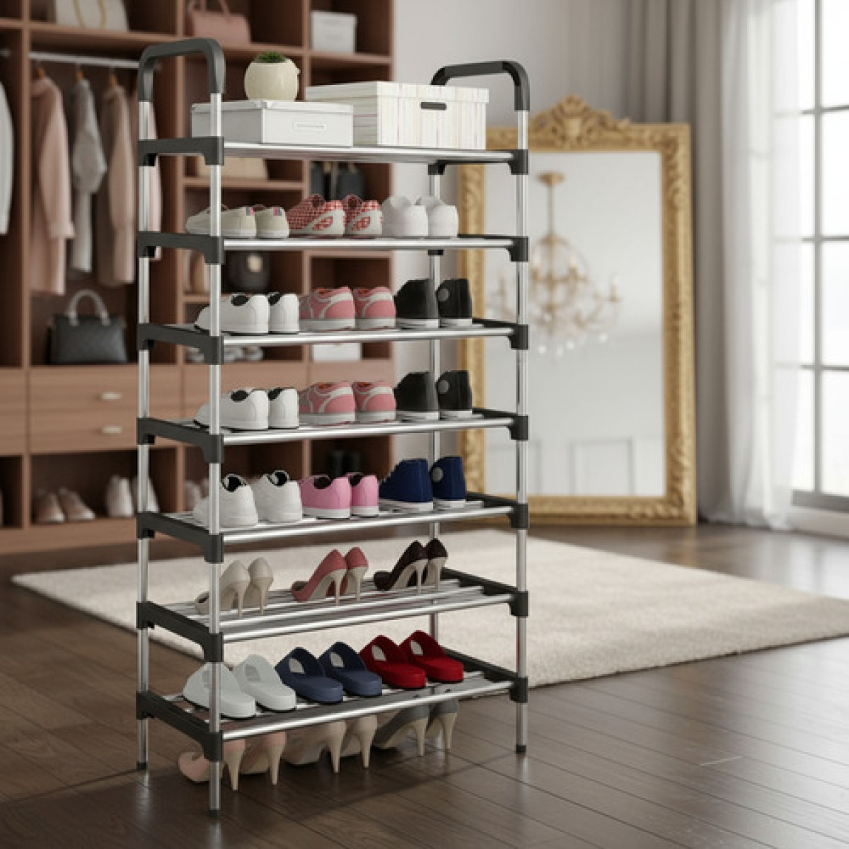 Organizador práctico y resistente, fabricado con estructura de caño de acero cromado y uniones de PVC de alta resistencia. Cuenta con 6 estantes, con capacidad para hasta 24 pares de calzado. Diseño apilable que optimiza el espacio y mantiene todo ordenado.
