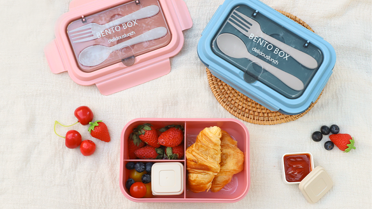 Caja de almuerzo con 3 compartimentos, cierre hermético y tenedor y cuhcara incluidos. Práctica y liviana, ideal para escuela u oficina.