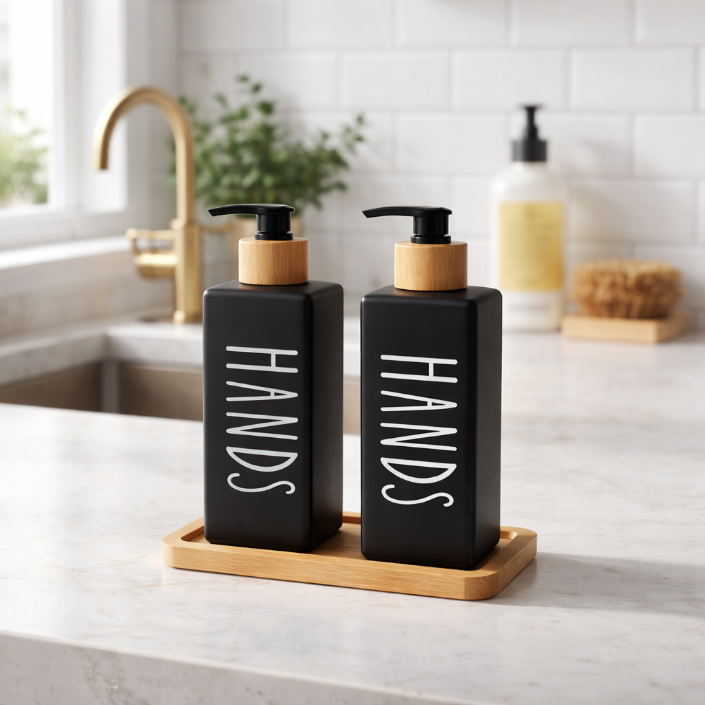 Set Dispensadores de Jabón Premium x2 + Bandeja de Bambú (500ml)